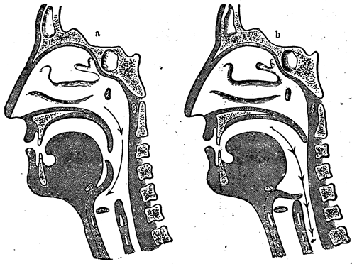 Воздух поступает в организм через две наружные ноздри , у каждой из которых имеется каемка волос, задерживающая посторонние частицы. Носовые ходы выстланы ресничным эпителием , в котором имеются бокаловидные клетки , секретирующие слизь , которая улавливает частицы, прошедшие через каемку волос. Слизь увлажняет вдыхаемый воздух, здесь же, в носовых ходах воздух нагревается, благодаря неглубоко залегающим кровеносным сосудам . В крыше задней части носовой полости находится обонятельный эпителий . Пройдя через носовые ходы, воздух попадает в глотку через два внутренних отверстия. Щелевидное отверстие , ведущее в гортань , защищено от попадания пищи, которая могла бы закупорить дыхательные пути , треугольным клапаном из хрящевой ткани - надгортанником .