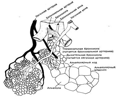 Легочные пузырьки, состоящие из тонкого слоя плоского эпителия, густо оплетенные капиллярами, образуют окончания |