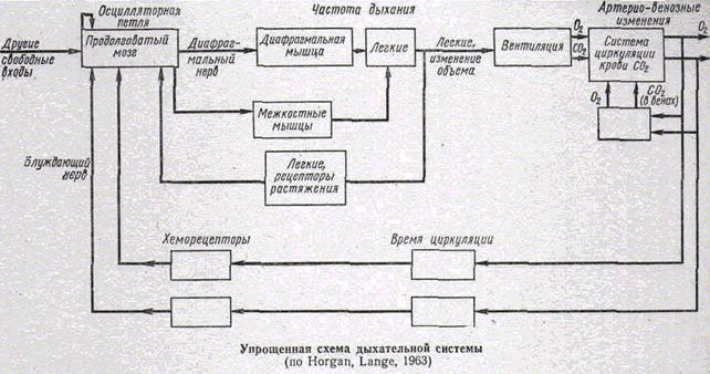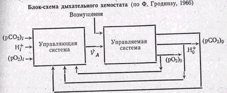 и напряжение в ней кислорода и углекислого газа на только непосредственно зависят от внешнего дыхания, но в свою очередь оказывают влияние на вентиляцию легких . В результате образуются регуляторные цепи с обратной связью, деятельность которых направлена на поддержание постоянства трех регулируемых констант - напряжения углекислого газа, напряжения кислорода и рН крови