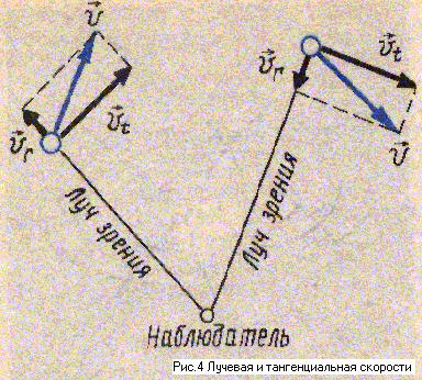 Первый способ — наблюдение за перемещением источника на фоне очень далеких звезд. Он дает оценку не полной скорости объекта, а проекции вектора скорости на плоскость, перпендикулярную лучу зрения (рис.4). Эту составляющую называют тангенциальной скоростью V t . Ее можно измерить лишь для сравнительно близких звезд по медленному изменению их положения на небе.