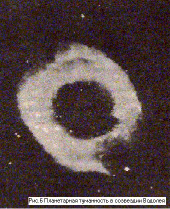 Полагают, что в молекулярных облаках происходит зарождение звезд из газа. Существует и обратный процесс — в межзвездную среду непрерывно поступает газ, «сбрасываемый» звездами. Мы уже знаем, что звезды, вспыхивающие как новые и сверхновые, теряют часть своей массы. Но и у обычных звезд, таких, как Солнце, на определенном этапе эволюции (после превращения в красный гигант) происходит отделение газовой оболочки, которая, медленно расширяясь, уходит в межзвездное пространство. Такие расширяющиеся оболочки известны у сотен звезд. Они называются планетарными туманностями (рис. 6) . В центре планетарной туманности всегда наблюдается звезда. Причина свечения этих объектов та же, что и у светлых газовых туманностей,— ионизующее ультрафиолетовое излучение горячей звезды.