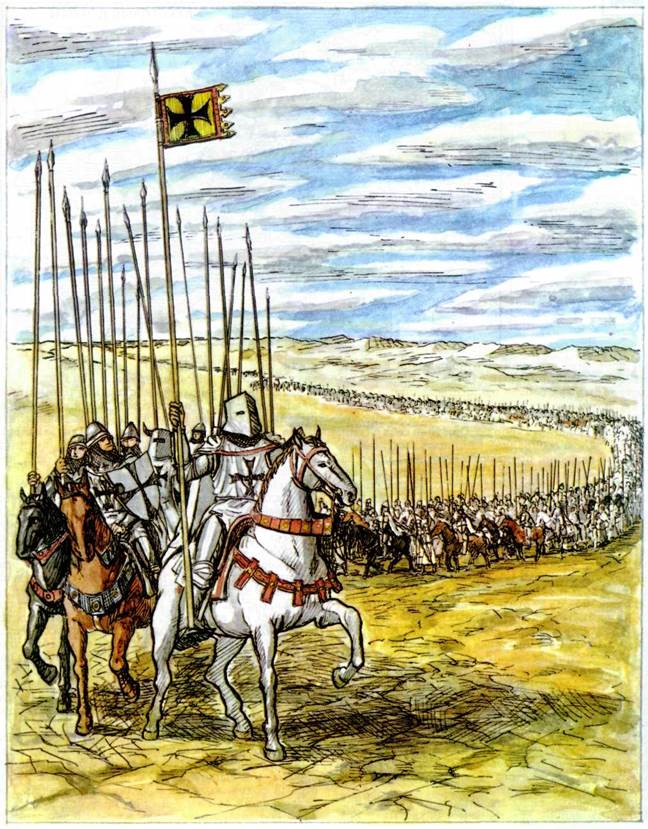 Дело в том, что рыцари очень любили сражаться, но совсем не хотели умирать — ни за сеньора, ни за святую церковь. Они должны были и хотели только побеждать. Этому, собственно, и служили их доспехи. Этому служил и «клин». Ведь когда отряд рыцарей медленно, шаг за шагом, приближался к врагу, он становился великолепной мишенью для лучников противника. Хорошо, если у того нет метких лучников. А если есть? Если у них вдобавок отличные дальнобойные, мощные луки? Монголы при Лигнице и англичане при Кресси и Пуатье именно из луков буквально расстреляли прекрасно защищенных доспехами рыцарей. А при построении «клином» перед вражескими стрелками оказывалось только несколько всадников в самом надёжном защитном снаряжении.