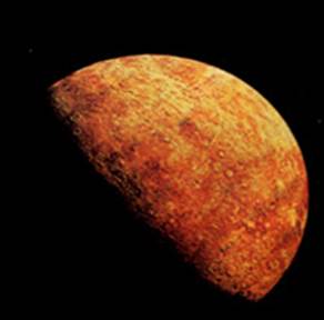 Меркурий является ближайшей к Солнцу планетой. Его диаметр всего в полтора раза больше диаметра Луны. Орбита имеет значительный эксцентриситет по сравнению с другими планетами. В перигелии Меркурий проходит на расстоянии 46 млн. км от Солнца, а в афелии удаляется до 70 млн. километров. Из-за сложения неравномерного движения по орбите (благодаря ее сильной вытянутости) с медленным вращением, Солнце на небе Меркурия останавливается, и даже двигается назад. На Меркурии нет времен года. Визуальные наблюдения затруднены, т.к. Меркурий в элонгации не удаляется больше чем на 18-28 градусов, большую часть времени скрываясь в лучах Солнца. Радиолокационными измерениями установлено, что вращение вокруг оси прямое, сидерический период равен примерно 59 земных суток, а меркурианские сутки длятся 220 земных суток. Атмосфера Меркурия имеет крайне низкую плотность и по существу является потоком частиц выбрасываемых Солнцем и охватывающим Меркурий. Более 100 лет назад утвердилось мнение, что Меркурий всегда обращен одной стороной к Солнцу, что приводит к тому, что половина его поверхности оказывается раскаленной. Первые сомнения принесли наблюдения теплового излучения планеты в 1962 году. Дневная сторона планеты оказалась не так горяча, как ожидалось, а от ночной стороны исходил ощутимый поток тепла. Тем не менее, температурный контраст очень высокий: температура на экваторе днем +480°C, а ночью -165°C. Поверхность Меркурия, изобилует кратерами и очень напоминает лунную. Кратеры не столь глубокие как на Луне, что говорит о большей силе тяжести на Меркурии. Хорошо видны эскарпы – следы тектонической активности – крутые уступы длиной от 20 до 500 км и высотой 1-2 км. Происхождение эскарпов связывают со сжатием планеты в процессе ее остывания и приливным влиянием Солнца. По-видимому, эскарпы образовались раньше, чем кратеры меркурианской поверхности, так как они местами разрушены кратерами. «Морей» там меньше, чем на Луне, причем они небольшие. Диаметр меркурианского Моря Зноя 1300 км, как и Моря Дождей на Луне. Как и на Луне, большинство кратеров образовались в результате падений метеоритов. Там, где кратеров немного, мы видим сравнительно молодые участки поверхности. Старые, разрушенные кратеры заметно отличаются от более молодых кратеров, хорошо сохранившихся. Наилучшими условиями для наблюдений являются весенний период для западной элонгации (утренняя видимость) и осенний для восточной элонгации. В эти моменты эклиптика расположена таким образом, что высота Меркурия над горизонтом наибольшая. Спутников Меркурий не имеет.