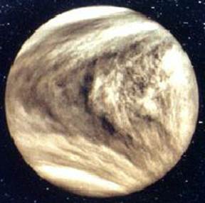 Орбита Венеры почти круговая (эксцентриситет менее 1%), но видимые угловые размеры изменяются очень сильно из-за того, что расстояние от Венеры до Земли в верхнем и нижнем соединениях меняется от 40 до 260 млн. км. При визуальных наблюдениях отчетливо видны фазы Венеры, однако различить детали на поверхности не удается из-за равномерной плотной атмосферы, открытой еще Ломоносовым при прохождении Венеры по диску Солнца. Вращение вокруг оси(обратное) удалось установить радиолокационным способом. Период вращения оказался равным 243 земным дням, а период обращения вокруг Солнца - 225 суткам. За один оборот вокруг Солнца на Венере наблюдаются два его восхода и захода. . Продолжительность солнечных суток на Венере составляет 116,8 земных суток, а венерианский год состоит приблизительно из двух венерианских солнечных суток. Диаметр Венеры почти такой же как у Земли (95%), а масса составляет 80% от массы Земли, и густая плотная атмосфера делает их очень похожими. Температура у поверхности Венеры очень высокая (около 500 град С) и остается все время почти одинаковой. Высокая температура поверхности Венеры обусловлена парниковым эффектом. Густая плотная атмосфера пропускает лучи Солнца, но задерживает инфракрасное тепловое излучение, идущее от нагретой поверхности. Облачный слой сильно ослабляет солнечный свет, освещенность у поверхности Венеры примерно такая же, как у поверхности Земли в облачный день, однако что небо Венеры и ее ландшафт имеют оранжевый цвет из-за особенностей состава атмосферы. Радиолокационные наземные наблюдения обнаружили на этой планете множество неглубоких кратеров, диаметры которых от 30 до 700 км. В целом эта планета оказалась наиболее гладкой из всех планет земной группы, хотя и на ней есть большие горные массивы и протяженные возвышенности, вдвое превышающие по размерам земной Тибет. Грандиозен потухший вулкан Максвелл, его высота 12 км, поперечник подошвы 1000 км, диаметр кратера на вершине 100 км. Сведения о внутреннем строении Венеры опираются, главным образом, на теорию. Современная модель планеты трехслойная: ядро, нижняя мантия и верхняя мантия. Ядро планеты несколько меньше, чем у Земли. На него приходится приблизительно 12% массы планеты (у Земли 16%). Предполагается, что оно состоит из расплавленного железа. Литосфера, может быть, более мощная, толщина коры - неизвестна. С внутренним строением планеты связана и проблема отсутствия магнитного поля: на всех планетах земной группы, кроме Венеры, есть собственное магнитное поле. Самыми сильными магнитными полями обладают планеты гиганты и Земля. Спутников Венера не имеет.