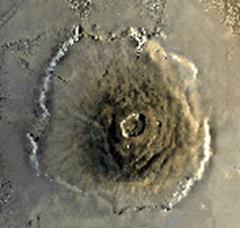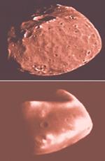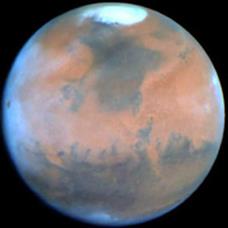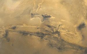 Поверхность Марса изобилует кратерами. Особенно много их в южном полушарии планеты. Темные области, занимающие значительную часть поверхности планеты, получили название морей. Диаметры некоторых морей превышают 2000 км. Возвышенности, напоминающие земные континенты, представляющие собой светлые поля оранжево-красного цвета. Как и на Венере, здесь есть огромные вулканические конусы. Высота наибольшего из них - Олимпуса - превышает 25 км, диаметр кратера 90 км. Диаметр основания этой гигантской конусообразной горы более 500 км. О том, что миллионы лет назад на Марсе происходили мощные вулканические извержения и смещались поверхностные пласты, свидетельствуют остатки лавовых потоков, огромные разломы поверхности (один из них - Маринер - тянется на 4000 км), многочисленные ущелья и каньоны. Возможно, что именно некоторые из этих образований (например, цепочки кратеров или протяженные ущелья) исследователи Марса еще 100 лет назад приняли за "каналы", существование которых впоследствии долгое время пытались объяснить деятельностью разумных обитателей Марса. Перестал быть загадкой и красноватый цвет Марса. Он объясняется тем, что грунт этой планеты содержит много глин, богатых железом. С близкого расстояния неоднократно фотографировались спутники Марса Деймос и Фобос и передавались панорамы поверхности "Красной планеты". Атмосфера Марса очень разрежена. При таком давлении вода закипает уже при температуре +2С. Именно поэтому никаких рек, озер или морей, заполненных водой на Марсе нет. По-видимому, каньоны Марса никогда не были заполнены водой, а происхождение их связано с древней тектоникой Марса - с движением огромных плит марсианской коры. Однако, были получены и снимки явно водно-эрозионных образований. В частности это видно на примере русла древней реки Нергал. Внимательное изучение русел древних рек показало, что их обмеление происходило постепенно. Много обсуждался вопрос, что же это было? Вода? Или какая другая текучая субстанция? Сошлись, все-таки, на воде. Куда же она делась? Вопросов много, на которые сейчас пока нет ответа. Известно лишь, что атмосфера Марса на 95% состоит из углекислого газа, водяных паров - всего 0,05%, кислорода 0,1-0,4%, азота 2,5%.