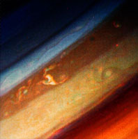 же обнаружены несколько коричневых пятен меньшего размера. Из-за большей, чем на Юпитере скорости потоков, эти ураганные вихри быстро затухают и перемешиваются с полосами. Скорости зональных ветров в районе экватора достигают 400 - 500 м/с, а на широте 30 градусов - около 100 м/с. Невысокая контрастность цветов на видимом диске Сатурна связана с тем, что из-за низких температур в надоблачной атмосфере Сатурна, где пары аммиака вымораживаются, образуется плотный слой тумана, скрывающего структуру поясов и зон, поэтому на Сатурне они не так четко видны, как на Юпитере.