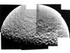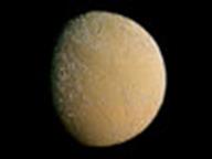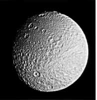 знаменита своей огромной трещиной-разломом, протяженностью 2000 км - три четверти длины экватора спутника! Фотографии Тефии, полученные от <Вояджера 2>, показали большой гладкий кратер с треть диаметра самого спутника, названный Одиссеем. Он больше, чем Гершель на Мимасе. К сожалению, на представленном снимке эти детали плохо различимы. О происхождении расщелины существуют несколько гипотез, в том числе и предполагающую такой период в истории Тефии, когда она была жидкой. При замерзании могла образоваться расщелина. Температура поверхности Тефии - 86 К.