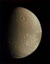 . На поверхности Дионы видны следы выброса светлого материала в виде инея, множество кратеров и извилистая долина.