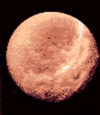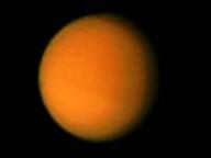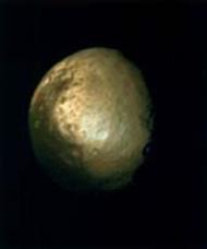 , диаметр которого 5150 км - один из наиболее интересных спутников Сатурна. Он является вторым по величине спутником в Солнечной Системе. Считается, что состав и процессы, происходящие в атмосфере этого спутника схожи с теми, что миллиарды лет назад можно было бы обнаружить в Земной атмосфере. Его поверхность неразличима сквозь плотную атмосферу, состоящую на 85% из азота, около 12% аргона и менее 3% метана. Также наблюдается небольшое количество этана, пропана, ацетилена, этилена, водорода, кислорода и других составляющих. Давление у поверхности Титана 1.6 атмосферы. Температура верхних слоев атмосферы этого спутника близка к 150°К, а поверхности - 94°К. Поверхность Титана состоит изо льда с примесью силикатных пород. Средняя плотность вещества, слагающего спутник - 1,9 г/см3