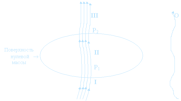 Рассмотрим более подробно типичную замкнутую поверхность нулевой массы (см. рис.). Пусть пучок мировых линий дважды пересекает эту поверхность: сначала на участке Р1, затем на участке Р2. Как описывается такая ситуация в сравнительно более узких рамках ОТО?