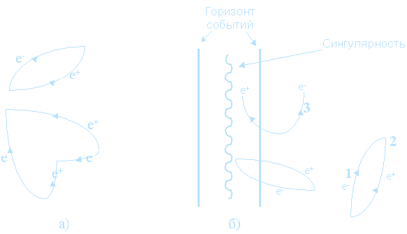 В плоском пространстве-времени в вакууме непрерывно рождаются и аннигилируют виртуальные пары частиц (а). Тяготение черной дыры влияет на этот процесс(б). (См.Дж.Нарликар "Неистовая Вселенная"М., Мир, 1985) Эффект Хокинга основан на взаимодействии вакуумных флюктуаций с черной дырой. Этот эффект иллюстрирует пространственно-временная диаграмма, приведенная на рисунке. Граница черной дыры отмечена парой жирных сплошных линий. Тяготение черной дыры, воздействующей на виртуальные пары, может приводить к трем качественно различным результатам, показанным на рисунке. Первый (1) - обе частицы пары падают в черную дыру; второй (2) - пара аннигилирует как обычно,словно черной дыры не существует; третий (3) - одна частица пары падает в черную дыру, а другая нет. Последний случай описывает механизм рождения частиц: удаленный наблюдатель, зарегистрировавший частицу, избежавшую падения в черную дыру, воспринимает этот акт так, будто эту частицу (или античастицу) породила черная дыра.