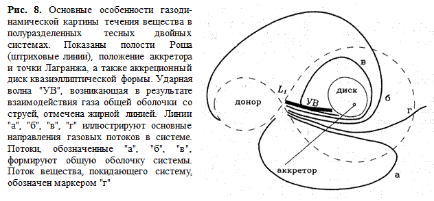 Оттекающий от центральных частей диска поток неоднороден. Его можно представить разбитым на сгустки холодной и плотной плазмы, движущейся в более горячей и разреженной среде (вроде всплывающих облаков). Перемещение этих «островков» относительно горячей среды разогревает их внешние части. Именно в этой горячей среде в результате фоторекомбинации и возникает широкая и мощная линия водородоподобного железа (энергия линии 6,95– 6,97 кэВ). Характерная температура в области формирования широкой линии порядка 1 кэВ, и высокая степень ионизации железа при такой температуре поддерживается процессами фотопоглощения квантов с энергиями 10 кэВ и выше, которые приходят из более глубоких слоев. Фотоны, испускаемые в линии, несколько раз рассеиваются на горячих электронах плазмы, что и создает широкую линию. Затем эти фотоны рассеиваются на более холодных всплывающих островках вещества практически не меняя своей энергии. При этом они проходят дополнительный путь и выходят из оболочки много дальше зоны формирования широкой линии. Именно эта эффективная оболочка с радиусом 0,1 расстояния между компонентами затмевается нормальной звездой. Анализ показывает, что иногда широкая линия железа также частично рождается в джете, однако физически это совсем другая линия – это К-линия низко ионизованного железа с энергией 6,4 кэВ, смещенная до энергии 7 кэВ из-за эффекта Доплера. Она уширяется при рассеянии на горячих электронах в джете, который неоднороден и состоит из отдельных более холодных сгустков, окруженных горячей разреженной плазмой. Добавим, что центральная оболочка и джет погружены в еще более разреженную корону (или гало), и даже при полном затмении центральной оболочки и джета мы все-таки наблюдаем остаточное рентгеновское излучение, рассеянное на электронах не затмевающейся короны. Нужная концентрация электронов во внешнем гало поддерживается дополнительной поставкой их при «таянии» всплывающих плотных островков в разреженной плазме внешней короны.