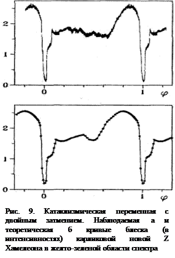 Еще задолго до открытия спектрально-двойных звезд внимание астрономов привлекла звезда Алголь (b Персея), замечательная правильным наступлением периодов, в течение которых ее блеск уменьшается более чем втрое, а затем снова увеличивается до прежней величины. Изменение блеска Алголя было замечено в 1669 г., а в 1782 г., т. е. более чем 100 лет спустя, глухонемой юноша – любитель астрономии Джон Гудрайк – высказал остроумную догадку, что блеск Алголя изменяется вследствие затмения его темным спутником. Предположение это в дальнейшем получило полное подтверждение. В настоящее время известно почти 2,5 тыс. звезд, блеск которых периодически изменяется по тем же причинам, что и у Алголя. Эти звезды были названы звездами типа Алголя. Они составляют большую часть так называемых затменно-двойных звезд.