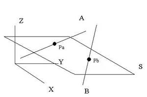Если мы будем двигать плоскость S вдоль оси Z, то точки пересечения Pa и Pb прямых A и B с плоскостью S будут перемещаться, при чем точка Pa будет перемещаться быстрее, чем точка Pb, так как угол прямой A к плоскости S меньше, чем угол прямой B. Для полноты картины остается только представить, что линии A и B являются фрагментами замкнутых кривых и закручены в спирали. Плоскость S лучше всего представить себе сделанной из эластичного, как тонкая резина, материала.