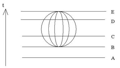 A, B, C, D, E – моменты времени продвижения трехмерного пространства (изображено горизонтальной линией) вдоль четырехмерного шара нитей.