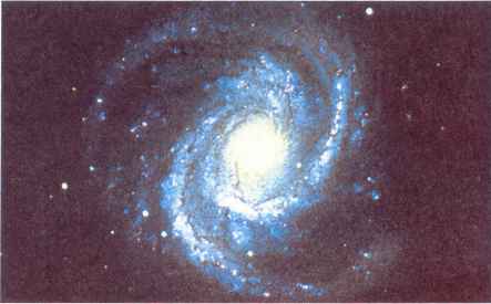 Это одна из ближайших к нам галактик, знаменитая Туманность Андромеды — спиральная звездная система, аналогичная нашей Галактике. Она находится на столь огромном расстоянии от нас, что свет от нее идет два миллиона лет. Подобные звездные системы (обозначаемые буквой «Б») состоят как бы из двух частей — центральной сферы и диска. С ребра подобная «конструкция» похожа на два приложенных друг к другу блюдца. Если же посмотреть на нее «сверху», то можно заметить, что из сферы выходят несколько спиралей. Самые яркие и массивные звезды галактики находятся в спиральных рукавах; между ними, а также в галактическом центре — слабые и маломассивные желтые и красные звезды.