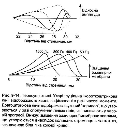 Рухи основи стремінця зумовлюють виникнення серії пересувних хвиль у перилімфі присінкових сходів. Графічно такі хвилі зображено на рис. 9-14.