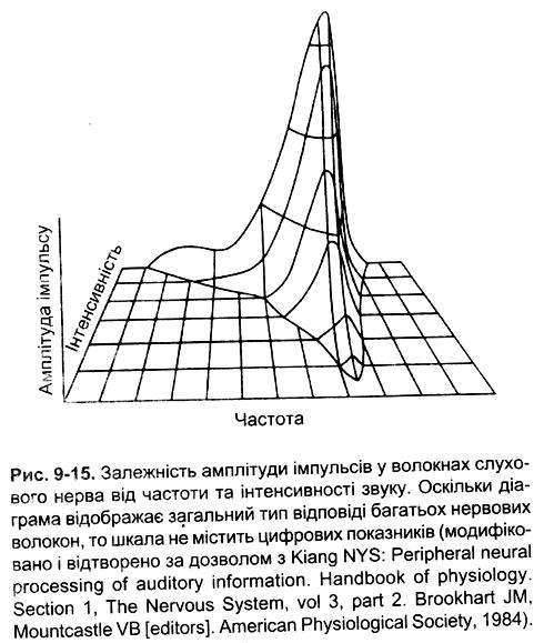Частота потенціалів дії окремих слухових нервових волокон пропорційна до сили звукових подразнень. За низької інтенсивності звуку кожен аксон розряджається лише під дією звуку певної частоти, відповідно до частини завитки, яку він репрезентує. У разі вищої інтенсивності звуку аксони розряджаються у відповідь на ширший спектр звукових частот (рис. 9-15), а точніше, реагують на хвилі, частота яких нижча від порога збудження.