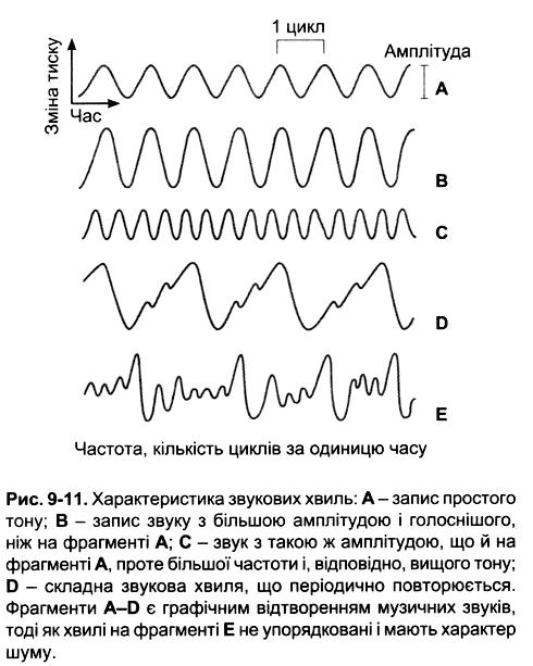 Звук є відчуттям, яке виникає під час потрапляння на барабанну перетинку поздовжніх коливань, а точніше - фаз згущення і розрідження молекул зовнішнього середовища. Результатом цих рухів є зміна тиску на барабанну перетинку за одиницю часу, що має вигляд серії хвиль (рис. 9-11). Сукупність таких рухів зовнішнього середовища називають звуковими хвилями. Звукові хвилі поширюються у повітрі зі швидкістю 344 м/с при 20°С на рівні моря. Швидкість хвиль зростає з підвищенням температури та висоти над рівнем моря. Інші середовища, у які може потрапляти людина, також проводять звукові хвилі, проте з іншою швидкістю. Наприклад, швидкість звуку у прісній воді при 20с С становить 1450 м/с, у морській воді вона ще вища. Вважають, що свист голубого кита досягає сили 188 децибел (див. нижче), і його чути на відстані 900 км.
