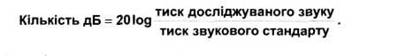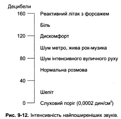 децибел прийнятий тиск 0,000204 Н/см2 , що є порогом слухових відчуттів середньостатистичної людини. На рис. 9-12 показані значення у децибелах найпоширеніших звуків. Треба пам'ятати, що шкала децибел є логарифмічною. Тому 0 децибел не означає, що звуку нема, а відображає наявність звуку, інтенсивність якого відповідає стандартові. Крім того, діапазон між 0 та 140 децибелами, який охоплює рівні від нижнього порогу слухового відчуття до такого, що може пошкодити орган Корті, практично відображає десятимільйонну (107 ) різницю в тискові, який чинять хвилі на барабанну перетинку. Іншими словами, якщо атмосферний тиск на рівні моря становить 1 бар, то діапазон інтенсивності від звуку ледь чутного до потенційно руйнівного для завитки, охоплює тиск від 0,0002 до 2000 мікробарів.