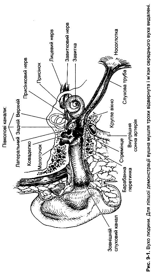 Вушна мушля зовнішнього вуха спрямовує звукові хвилі до зовнішнього слухового ходу. У деяких видів тваринвуха можуть рухатися у пошуку джерела звуків подібно до радарних антен. Від зовнішнього слухового ходу зовнішній слуховий канал веде до барабанної перетинки (рис. 9-1).