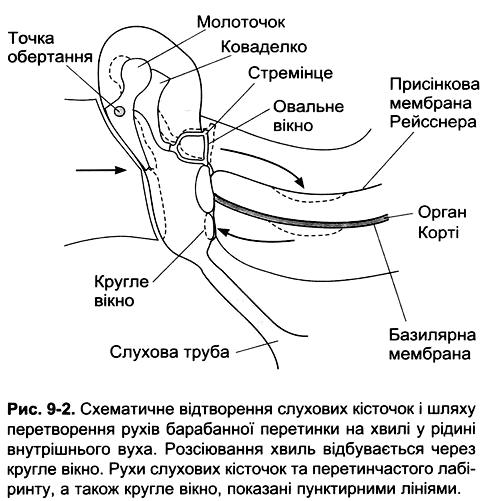 присінкових сходів завитки (див. рис. 9-2). Ця система підсилює тиск звукових хвиль, що доходять до овального вікна, оскільки важільна система молоточка і коваделка збільшує силу поштовхів у 1,3 раза, а площа барабанної перетинки значно перевищує площу основи стремінця. Хоча інерційність та опір усієї системи і зумовлюють деяку втрату енергії звуків, та підраховано, що за частоти до З 000 Гц близько 60% звукової енергії, що потрапляє на барабанну перетинку, досягає перилімфи присінкових сходів.