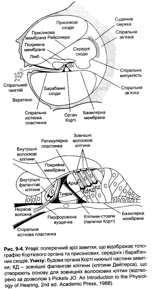 Розміщений на базилярній мембрані орган Корті містить волоскові клітини, що є слуховими рецепторами. Цей орган проходить від верхівки завитки до її основи і має спіральну форму. Апікальні відростки волоскових клітин пронизують щільну волокнисту пластинку, яку підтримують клітини-стовпи, або палички Корті (див. рис. 9-4). Волоскові клітини розміщені чотирма рядами: три ряди зовнішніх волоскових клітин містяться латераль-ніше від утвореного клітинами-стовпами внутрішнього тунелю, один ряд внутрішніх волоскових клітин -медіальніше. У кожній завитці людини міститься близько 20 000 зовнішніх волоскових клітин та 3 500 внутрішніх. Ряди волоскових клітин вкриває тонка, в'язка, еластична покривна мембрана, у яку втоплені кінчики волосків зовнішніх волоскових клітин. Волоски внутрішніх волоскових клітин покривної мембрани не досягають. Тіла аферентних нейронів, відростки яких охоплюють основи волоскових клітин, утворюють спіральний ганглій, що локалізований у складі веретена - кісткової осі, навколо якої закручена завитка. Близько 90-95% нейронів спірального ганглія іннервують внутрішні волоскові клітини, і лише 5-10% забезпечують іннервацію набагато численніших зовнішніх волоскових клітин; у цьому разі один нейрон іннервує кілька таких клітин. На противагу описаному вище, більшість еферентних волокон слухового нерва (див. нижче) закінчуються на зовнішніх волоскових клітинах. Аксони аферентних нейронів, що іннервують волоскові клітини, формують слухову (завиткову) частину присінко-во-завиткового слухового нерва і закінчуються на дорсальних та вентральних завиткових ядрах довгастого мозку. Загальна кількість аферентних та еферентних волокон у складі кожного слухового нерва становить близько 28 000.