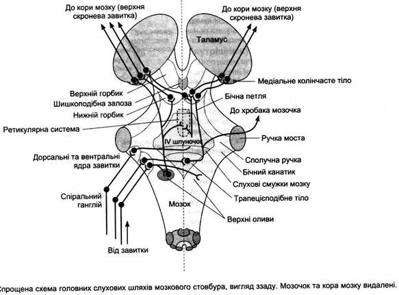 Від завиткових ядер слухові імпульси різними шляхами проходять до нижніх горбиків, що є центрами слухових рефлекторних дуг, та через медіальні колінчасті тіла таламуса до слухової кори. Інші імпульси проходять до ретикулярної формації (рис. 9-5). Інформація від обох вух сходиться до верхніх олив, і більшість нейронів усіх вищих рівнів отримує імпульси з обох боків голови. Первинна слухова кора, або 4 поле Бродмана, міститься у верхній частині скроневої частки. У людини вона локалізована у Сильвієвій борозніі в нормі її не видно на поверхні мозку. У первинній слуховій корі більшість нейронів отримує імпульси від обох вух, але тут також є смужки клітин, що їх стимулюють імпульси від контра-латерального і пригнічують імпульси від іпсилатерального вуха. Є кілька додаткових звукосприймальних полів, подібно до наявності кількох полів шкірної чутливості. Асоціативні слухові поля прилягають до первинних і охоплюють значну площу (див. нижче). Оливо-завитковий пучок є великим пучком еферентних волокон у кожному слуховому нерві, який починається як від іпсилатерального, так і контралатерального верхньо-оливних комплексів і закінчується переважно навколо базальної частини зовнішніх волоскових клітин органа Корті.
