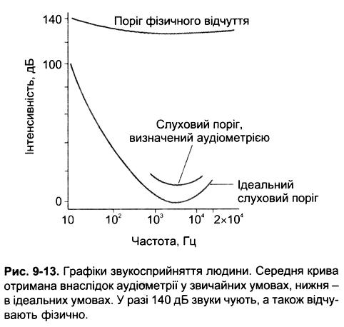 Людина може чути звукові частоти від 20 до 20 000 Гц (герц, або коливань за секунду). Деякі тварини, особливо кажани та собаки, чують звуки набагато вищої частоти. Пороги відчуттів людського вуха відрізняються для тонів різної висоти, досягаючи максимальної чутливості в діа-пазоні 1-4 кГц. Для порівняння, тон чоловічого голосу становить близько 120 Гц, тон голосу середньостатистичної жінки - 250 Гц. Пересічна людина може розрізнити до 2 000 тонів, однак музичні вправи дають змогу цю кількість значно збільшити. Найлегше розрізняють тони у діапазоні 1-3 кГц, значно важче - тони вищих або нижчих частот (рис. 9-13).