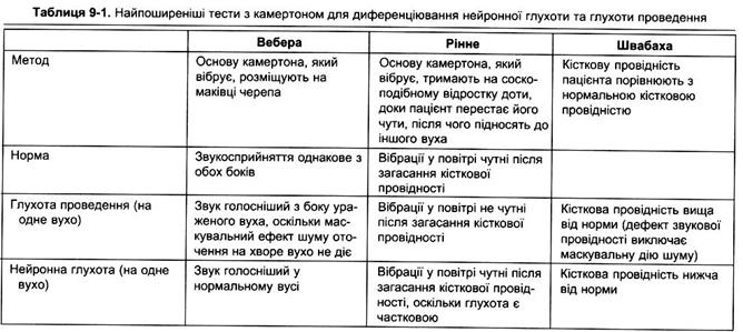 Клінічна глухота може бути зумовлена порушеннями передавання звуків у зовнішньому або середньому вусі (глухота передавання, або кондуктивна ), ушкодженнями волоскових клітин або провідних шляхів (сенсоневральна глухота ). Ці дві форми патології звукосприйняття розрізняють за допомогою різноманітних простих тестів з камертоном. Три такі тести, названі за прізвищами їхніх авторів, наведені у табл. 9-1. Тести Вебера і Швабаха відображають маскувальний вплив шуму оточення на слуховий поріг.