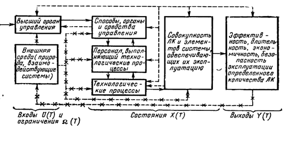 Выделение целостного множества объектов или понятий в систему должно определяться целями исследования. Если исходить из указанных выше целей разработки программы эксплуатации и оперативного управления эксплуатацией какой-то системы ЛК. то можно в общем виде (и конечно, не единственно возможном) представить систему эксплуатации совокупности ЛК (СЭЛК) так, как это показано на рисунке 1. На этой схеме даны укрупненные компоненты, определяющие входы U(T), ограничения Ω(T), состояния Х(Т) и выходы Y(Т) системы эксплуатации, а также некоторые связи между ними.