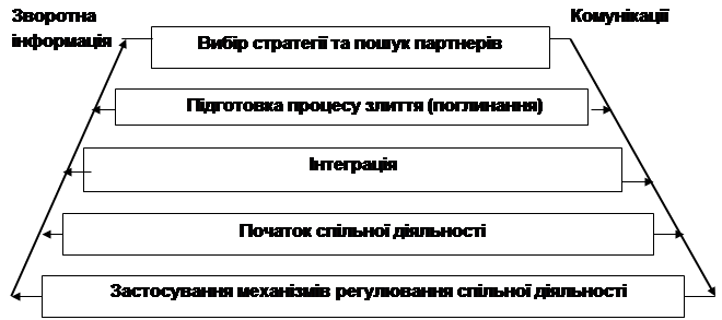 1. Вибір стратегії та пошук партнерів. Визначаються основні стратегічні цілі, що може досягнути компанія через злиття (поглинання). Слід розрізняти декілька етапів: