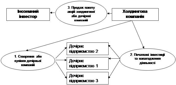 При створенні дочірньої фірми холдинг разом із контрольними функціями бере на себе значну частку ризику, що є сприятливою умовою для іноземного партнера. Нова фірма, подолавши труднощі початкового етапу діяльності, доводить свою життєздатність і характеризується сприятливим прогнозом росту: стає достатньо привабливим об'єктом для іноземного інвестора. Інвестор буде зацікавлений в посиленні свого впливу й у збільшенні контролю над цією фірмою.