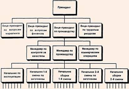 Вертикальное разделение труда, т.е. отделение работы о координации от непосредственного выполнения заданий, необходимо для успешной групповой работы. Преднамеренное вертикальное разделение труда в организации дает в результате иерархию управленческих уровней. Центральной характеристикой этой иерархии является формальная подчиненность лиц на своем подчинении нескольких руководителей среднего звена, представляющих различные функциональные области. Эти руководители среднего звена могут в свою очередь иметь несколько подчиненных из числа линейных руководителей. Иерархия пронизывает все организацию, спускаясь на уровень неуправленческого персонала (рис. 2).