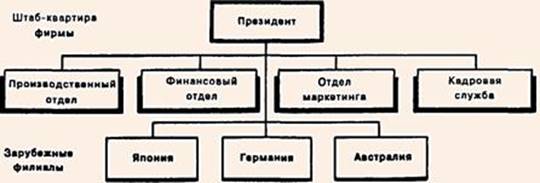 Если деятельность организации охватывает большие географические зоны, особенно в международном масштабе, то может оказаться целесообразной структура организации по территориальному принципу, т.е. по месту расположения ее подразделений (рис. 6). Региональная структура облегчает решение проблем, связанных с местным законодательством, обычаями и нуждами потребителями. Такой подход упрощает связь организации с клиентами, а также связь между членами организации.