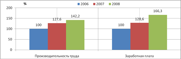 Производительность труда в 2007 г. составила 177,8 тыс. руб./чел., в 2008 г. – 226,9 тыс. руб./чел, в 2009 г. – 252,9 тыс. руб./чел. В 2008 г. по сравнению с 2007г. произошло увеличение показателя на 49,1 тыс. руб./чел. или на 27,6 %. В 2009 г. по сравнению с 2008 г. рост показателя составил 26 тыс. руб./чел. или 11,5%.