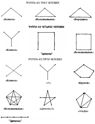 Существуют устоявшиеся образцы коммуникационных сетей для групп одной и той же или разной численности (приложение 4). В сетях типа "кружок" члены группы могут коммуницировать только с теми, кто расположен рядом с ними. В сетях типа "колесо" представлена формальная, централизованная иерархия власти, при которой подчиненные коммуницируют друг с другом через своего начальника. Объективной основой такой ситуации является то, что лицо, находящееся в центре "колеса", имеет больше коммуникационных связей, чем другие члены группы. Он получает больше посланий, чаще признается другими членами группы как лицо, выполняющее лидерские функции, больше оказывает социального влияния на других членов группы, обычно несет большую ответственность за передачу информации, от него больше, чем от других, ожидается окончательное решение проблемы.