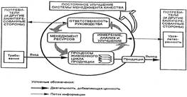 На рисунке 1 приведена основанная на процессном подходе система менеджмента качества, описанная в семействе стандартов ИСО 9000 (предназначение настоящего стандарта заключается в том, чтобы побуждать к принятию процессного подхода к менеджменту организации). Рисунок иллюстрирует, что заинтересованные стороны играют существенную роль в предоставлении организации входных исходных данных. Наблюдение за удовлетворенностью заинтересованных сторон требует, оценки информации, касающейся восприятия заинтересованными сторонами степени выполнения их потребностей и ожиданий.