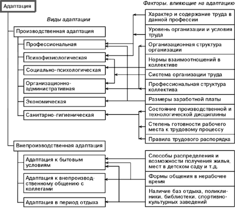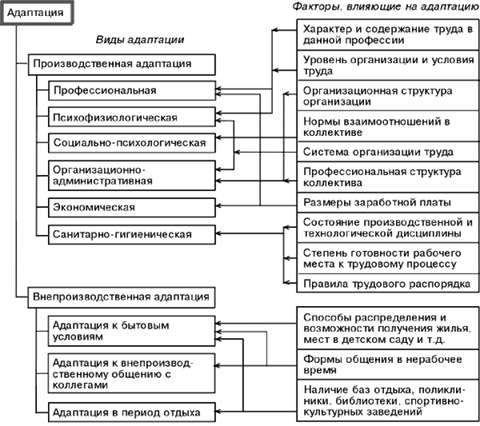 В самом общем виде адаптация — «процесс приспособления работника к условиям внешней и внутренней среды». Термин «адаптация» чрезвычайно широк и применяется в различных областях науки. В социологии и психологии выделяют социальную и производственную адаптацию. В определенной мере эти два вида адаптации пересекаются друг с другом, но каждая из них имеет и самостоятельные сферы приложения: социальная деятельность не замыкается на производстве, а производственная — включает и технические, и биологические, и социальные аспекты.