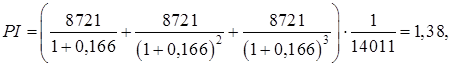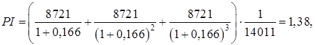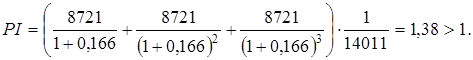 Индекс рентабельности инвестиций PI = 1,38 Если PI > 1, то проект следует принять; При PI < 1, то проект следует отвергнуть; Наш проект следует признать прибыльным. |