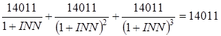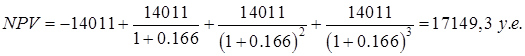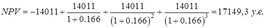 Чистая приведенная стоимость проекта NPV =17149,3 у. е. Если NPV > 0, то проект следует принять; NPV < 0, то проект следует отвергнуть; Наш проект следует признать прибыльным. |