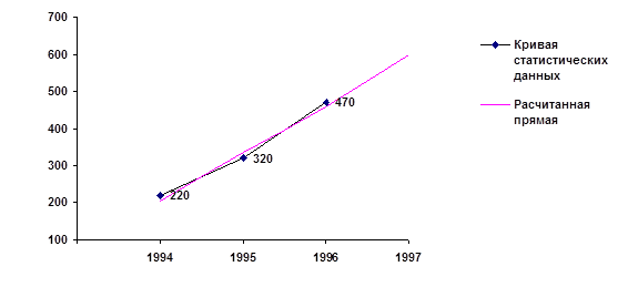Из графика видно что в 2005 году теоретический объем спроса составит 600 единиц продукции.