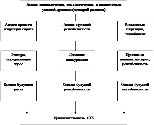 Оценка привлекательности СЗХ начинается с общего анализа и прогноза экономических, социальных и политических условий. Среди применяемых методов прогнозирования глобальных условий внешней среды наибольшее распространение получил метод разработки сценариев будущих условий. Сценарием называется формализованное описание наиболее вероятной последовательности взаимосвязанных событий и их последствий, которые отражают реализацию определенной программы или стратегии.