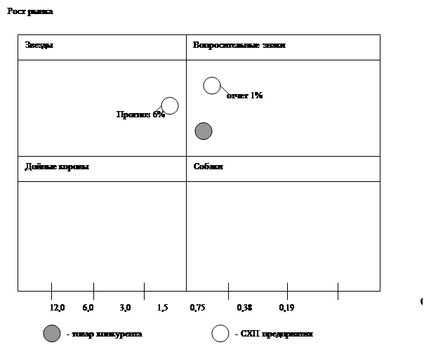 Для проведения анализа положения и перспектив развития по каждому СХП определяется стадии жизненного цикла отрасли. Емкость рынка отличается соответствующим размером круга, а рыночная доля предприятия - сектором.