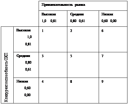 На основе расчетов привлекательности рынка и конкурентоспособности предприятия строится матрица стратегического анализа. По горизонтальной оси отмечаются интервалы уровней привлекательности рынка, по вертикальной - уровень конкурентоспособности СХП.