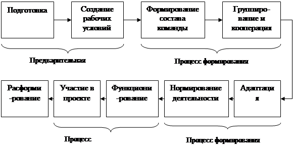 Вообще, процесс формирования команды – задание, требующее высокой управленческой компетенции. При его осуществлении требуется не только наличие правильно подобранных, высококвалифицированных специалистов, но и людей, желающих работать вместе, сообща, как команда. Иначе сама задумка создания команды окажется бессмысленной. Любой процесс имеет свою продолжительность, поэтому состоит из некоторых этапов. Т.к. создание команды – это определенный процесс, то он состоит из нескольких этапов. Принцип формирования различного рода команд един для всех за некоторыми исключениями. Эти исключения зависят от целей создания той или иной команды, и всегда имеет место принцип «индивидуальности», т.е. добавление или исключение элементов, характерных для конкретной команды. Поэтому, описывая процесс формирования команды стратегических изменений, опираться будем на общие принципы создания команды.