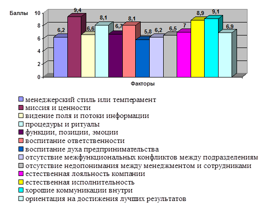 Следом идут факторы «хорошие коммуникации внутри» – 9,1 балл и «естественная исполнительность» – 8,9 балла. Также к наиболее значимым факторам были отнесены «процедуры и ритуалы» и «воспитание ответственности».