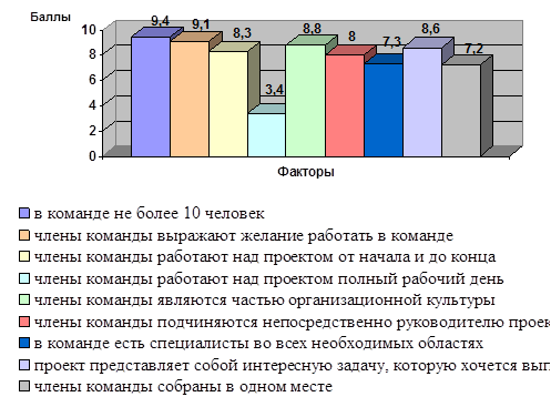 Второй заявленной группой факторов, влияющих на сплоченность команды, были ситуационные факторы. Участники опроса считают, что наиболее значимым фактором является то, что в команде должно быть не более 10 человек – 9,4 балла. Кроме этого, члены команды должны желать работать в команде и быть частью организационной культуры. Чуть менее важным участники опроса считают то, что проект должен представлять собой интересную задачу, которую будет хотеться выполнять членам команды стратегических изменений. Наименее важным фактором является, судя по результатам анкетирования, является то, что члены команды должны работать над проектом полный рабочий день.