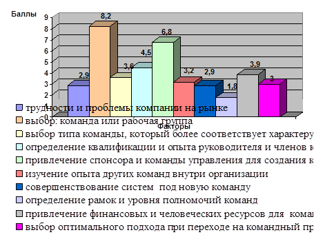 Среди третьей группы предложенных для оценки факторов, участники опроса наиболее значимым фактором для сплоченности команды стратегических изменений считают «выбор: команда или рабочая группа» – 8,2 балла. Можно выделить еще один по значимости фактор, это привлечение спонсора и команды управления для создания команды – 6,8 балла. Остальные факторы получили оценку менее 5 баллов, отсюда следует, что участники опроса считают, что они оказывают минимум влияния на сплоченность команды. Наименее значимым для сплоченности оказалось определение рамок и уровня полномочий команд.