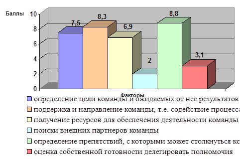 Из числа четвертой группы факторов участники опроса выделили наиболее существенным такой фактор, как «определение препятствий, с которыми может столкнуться команда» – 8,8 баллов. Вторым значимым фактором является «поддержка и направление команды, т.е. содействие процессам» – 8,3 балла. На третье место поставлен фактор «определение цели команды и ожидаемых от нее результатов» – 7,5 баллов. Минимальное влияние оказывает поиск внешних партнеров команды.
